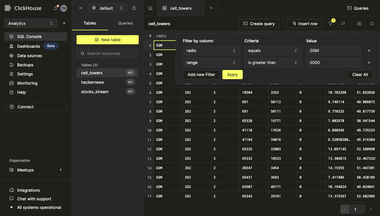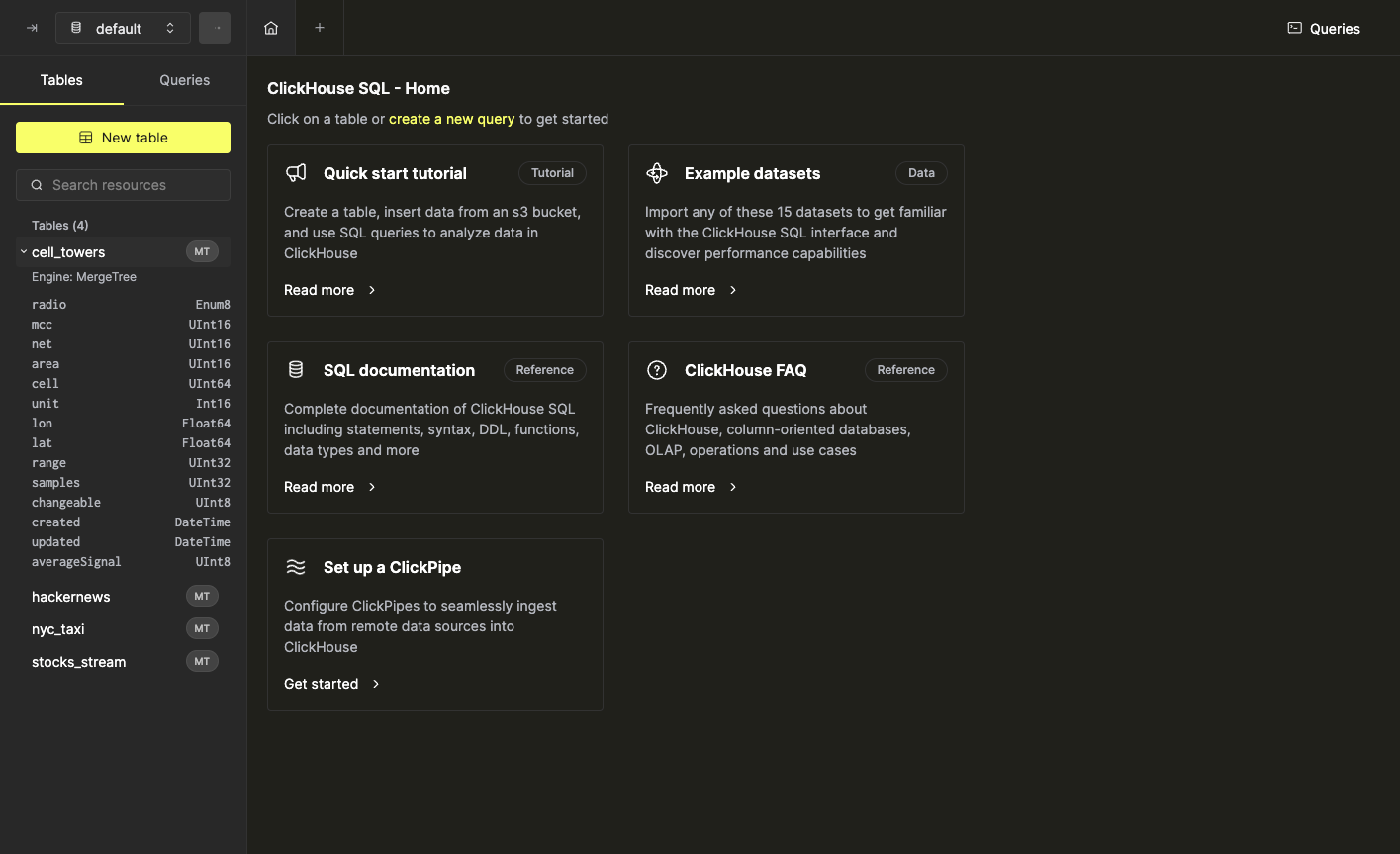 Обзор таблиц, содержащихся в вашей инстанции ClickHouse, можно найти в области левой боковой панели. Используйте селектор базы данных в верхней части левой панели, чтобы просмотреть таблицы в конкретной базе данных.