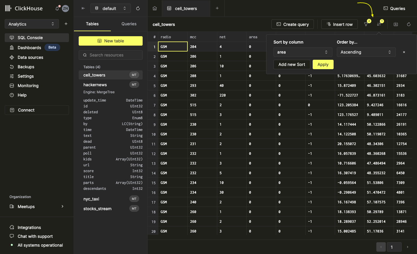 SQL консоль позволяет одновременно фильтровать и сортировать таблицу. Для этого добавьте все желаемые фильтры и сортировки с помощью описанных выше шагов и нажмите кнопку 'Применить'.