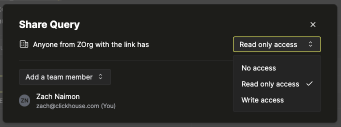 Чтобы настроить доступ к запросу для конкретных участников, выберите нужного участника команды из селектора "Добавить участника команды":