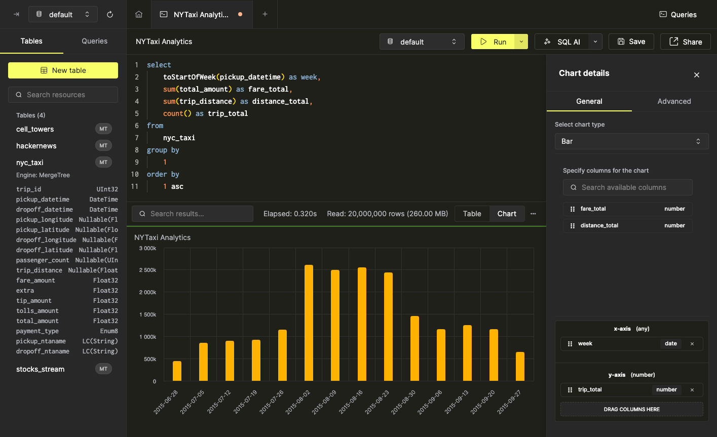 Некоторые данные могут быть легче интерпретированы в виде графика. Вы можете быстро создавать визуализации из данных результатов запроса прямо из SQL консоли всего за несколько кликов. В качестве примера мы будем использовать запрос, который рассчитывает еженедельную статистику для поездок такси в Нью-Йорке: