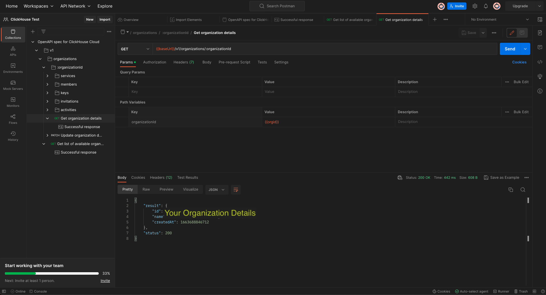 - В разделе "Спецификация OpenAPI для ClickHouse Cloud" разверните папку > V1 > organizations