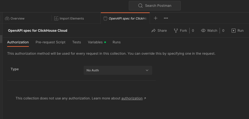 Этот гайд поможет вам протестировать API ClickHouse Cloud с помощью Postman. Приложение Postman доступно для использования в веб-браузере или может быть загружено на настольный компьютер.