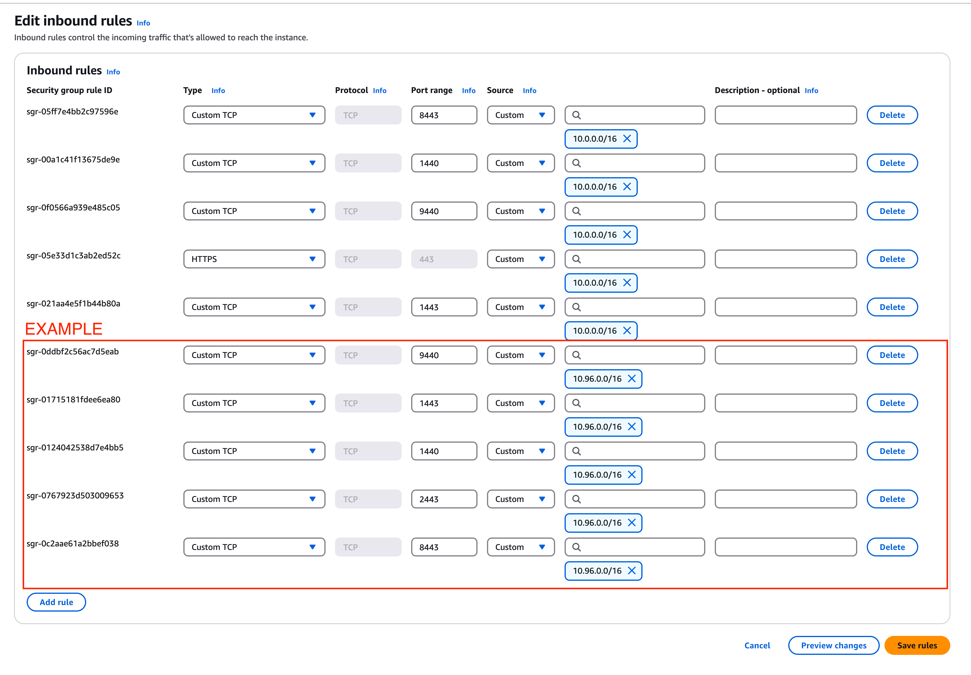 - Отредактируйте правила Inbound этой группы безопасности и добавьте диапазон CIDR пирингового VPC (или укажите необходимый диапазон CIDR по необходимости).