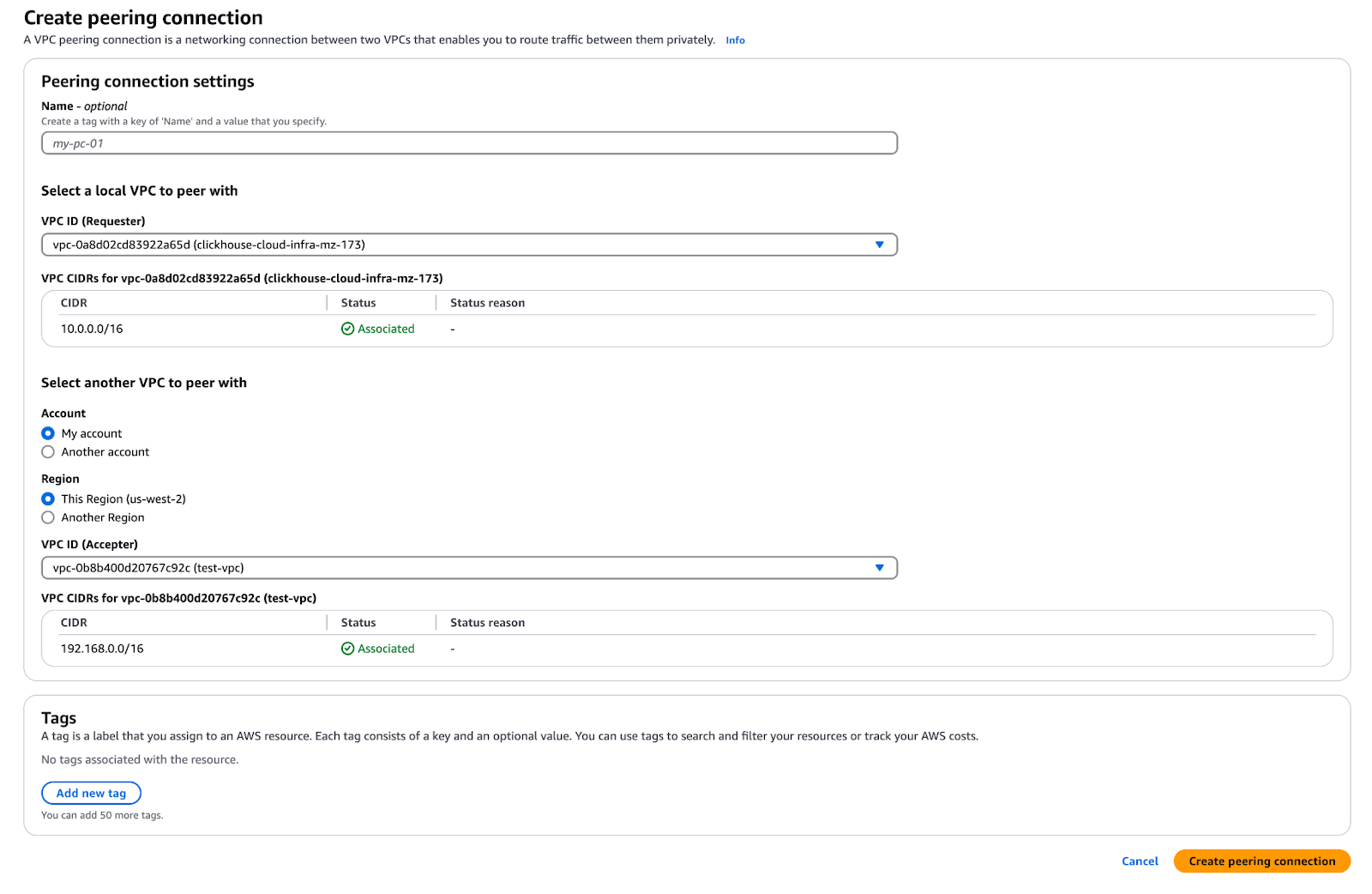 - Установите VPC Запросчика на идентификатор VPC ClickHouse.