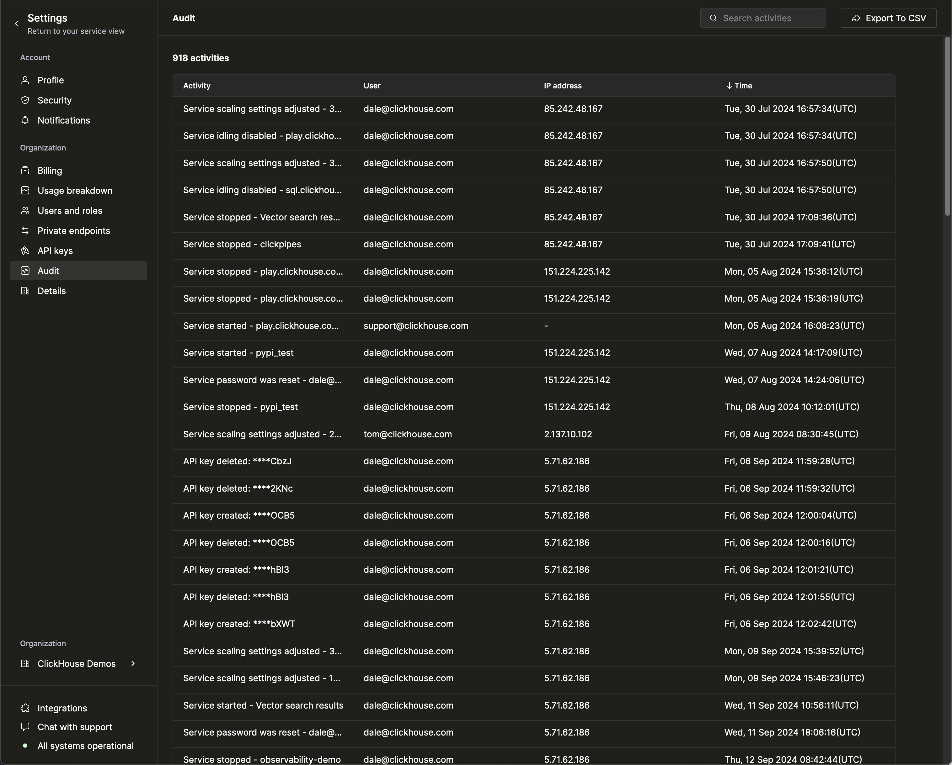 Выберите вкладку Audit в левом меню, чтобы увидеть, какие изменения были внесены в вашу организацию ClickHouse Cloud, включая информацию о том, кто внес изменения и когда это произошло.