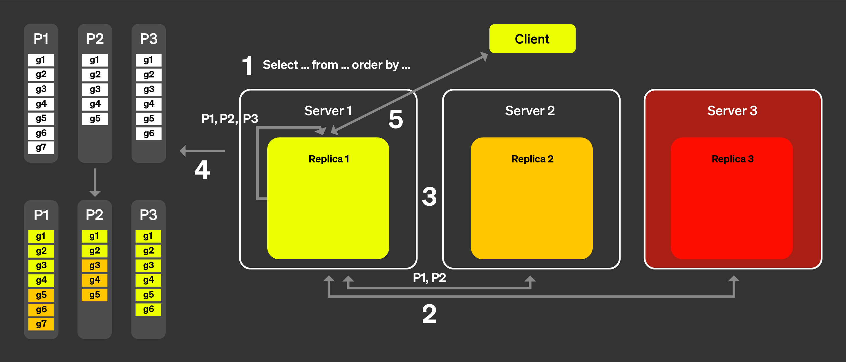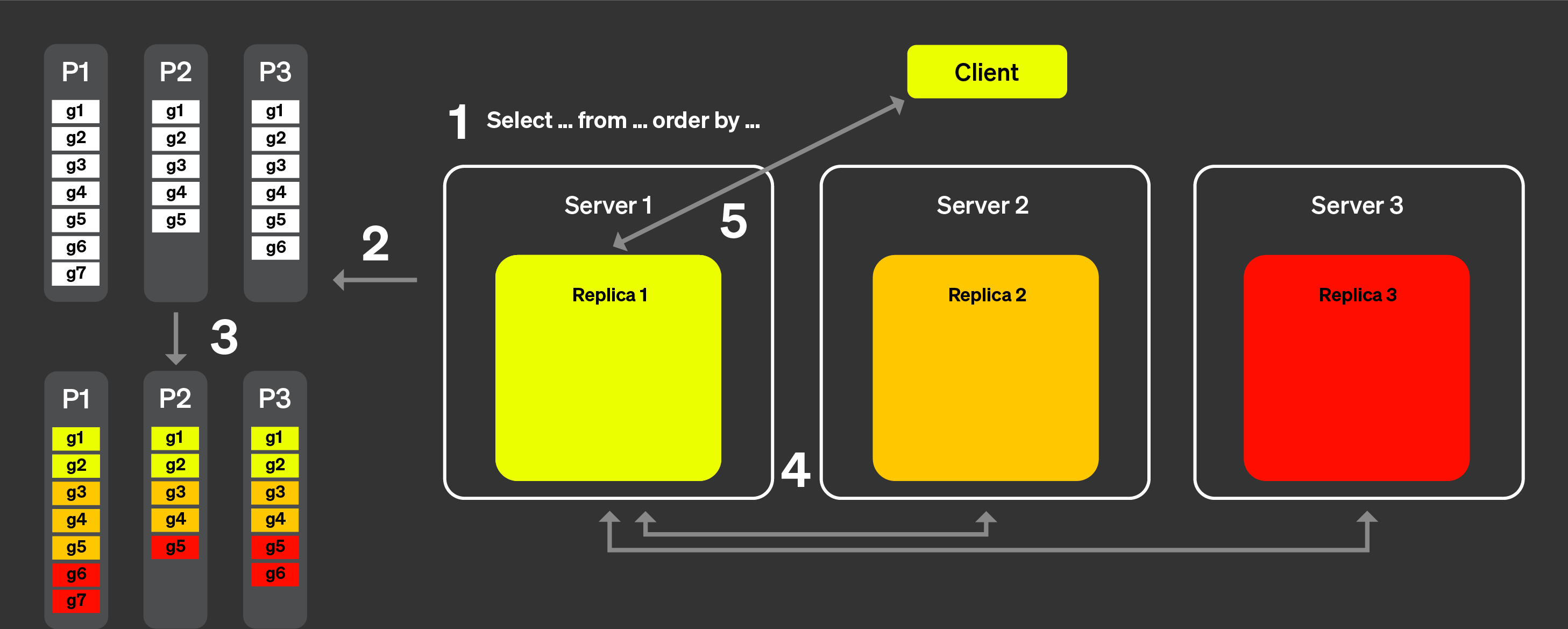 Чтобы параллелизовать выполнение запросов через несколько серверов, нам сначала нужно назначить один из наших серверов координатором. Координатор — это тот, кто создает список задач, которые необходимо выполнить, обеспечивает их выполнение, агрегирует и возвращает результат клиенту. Как и в большинстве распределенных систем, эту роль будет исполнять узел, который получает начальный запрос. Мы также должны определить единицу работы. В шардированной архитектуре единицей работы является шард, подмножество данных. В параллельных репликах мы будем использовать небольшую часть таблицы, которая называется гранулы, в качестве единицы работы.