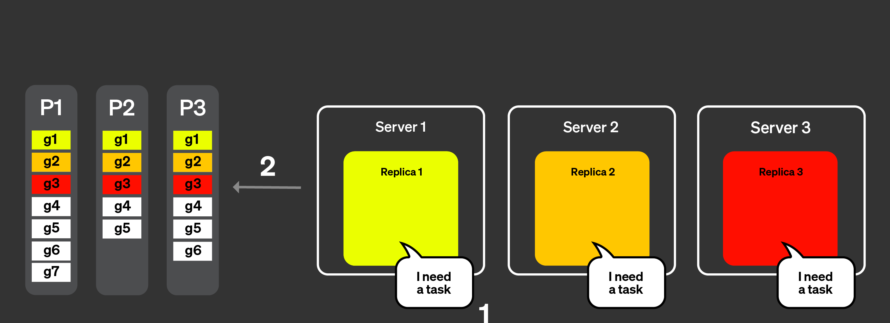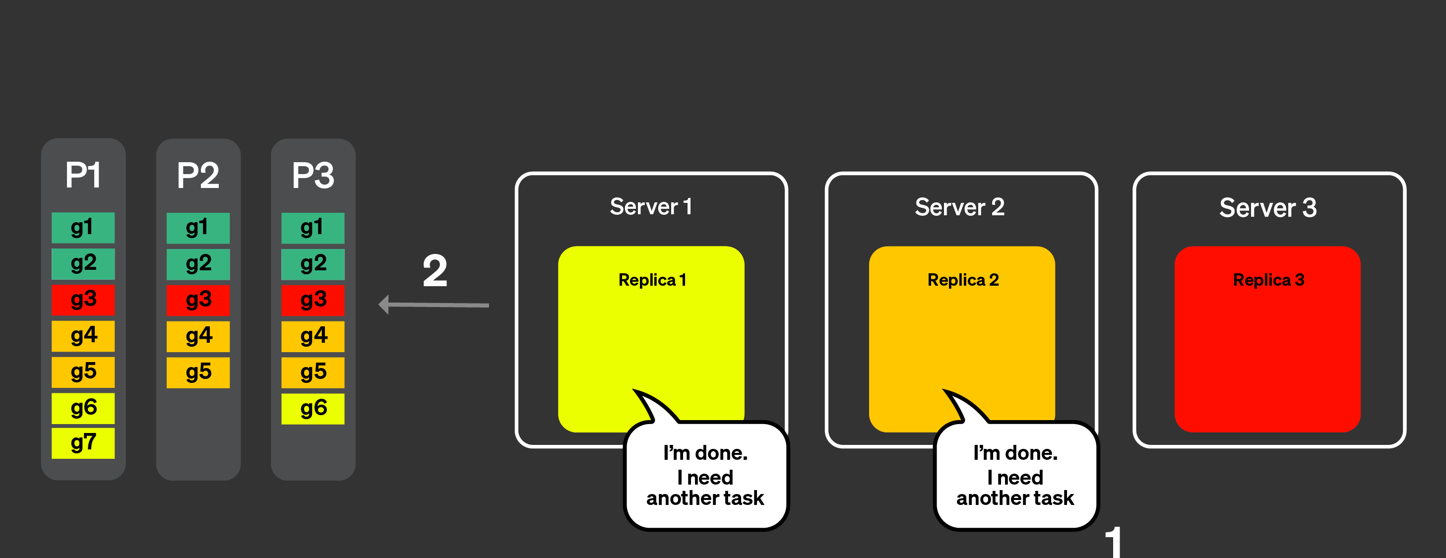 Реплики 1 и 2 могут очень быстро закончить свою задачу. Они запросят еще одну задачу у координатора.