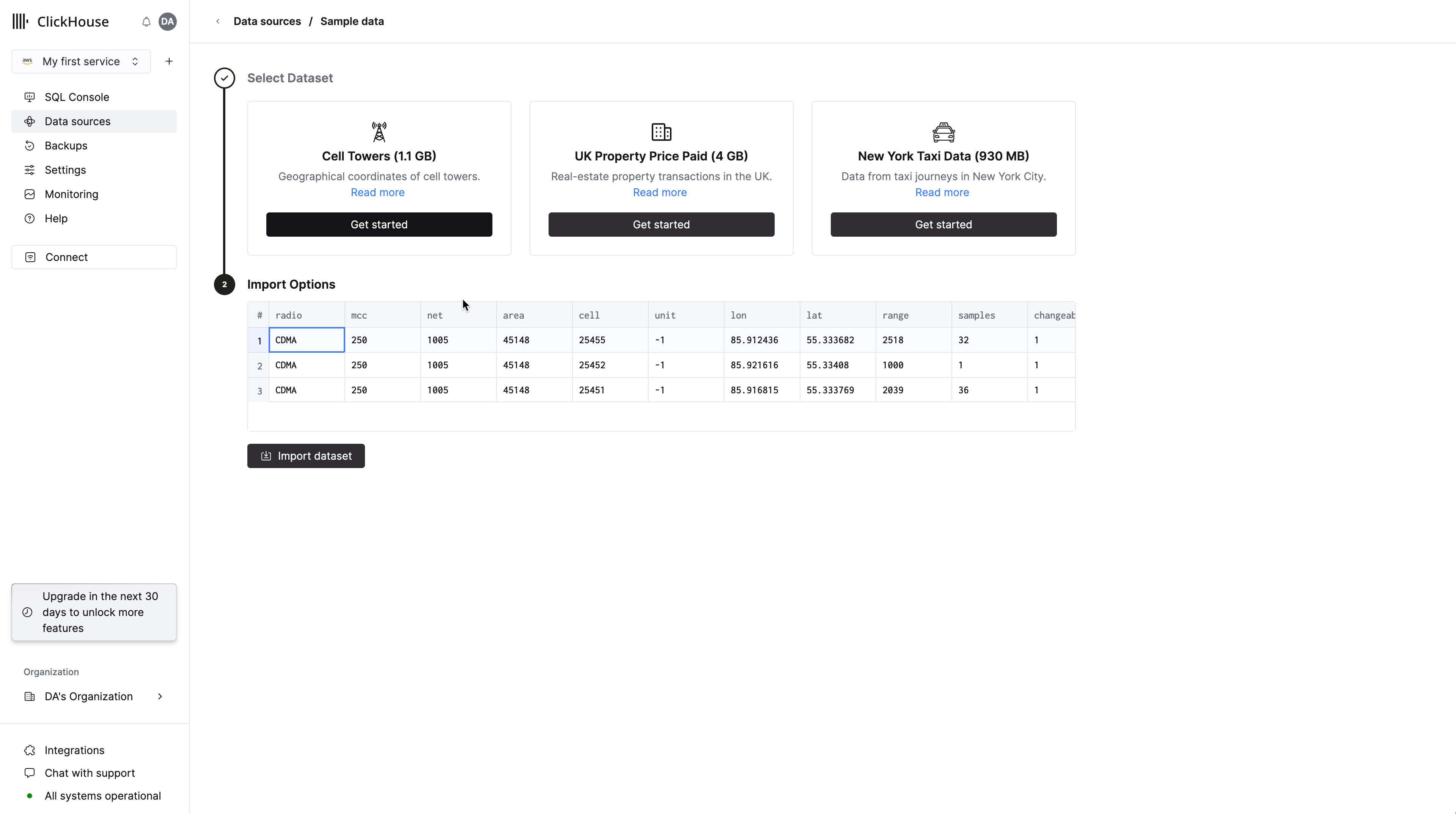 ClickHouse Cloud предоставляет легкую кнопку для загрузки этого набора данных из S3. Войдите в свою организацию ClickHouse Cloud или создайте бесплатный пробный аккаунт на ClickHouse.cloud.