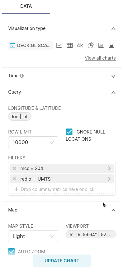 График deck.gl Scatterplot требует долготу и широту, и при этом можно применить один или несколько фильтров к запросу. В этом примере применяются два фильтра: один для башен с UMTS радиосигналами и другой для мобильного кода страны, назначенного Нидерландам.