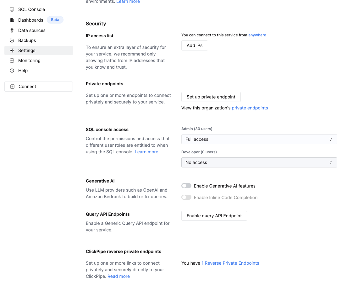 Вы можете управлять существующими обратными частными конечными точками в настройках сервиса ClickHouse Cloud: