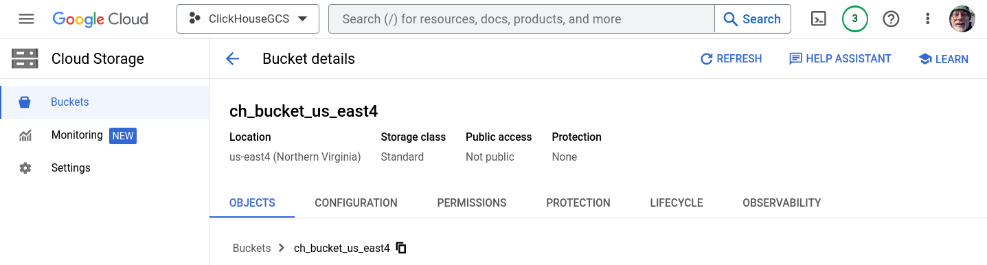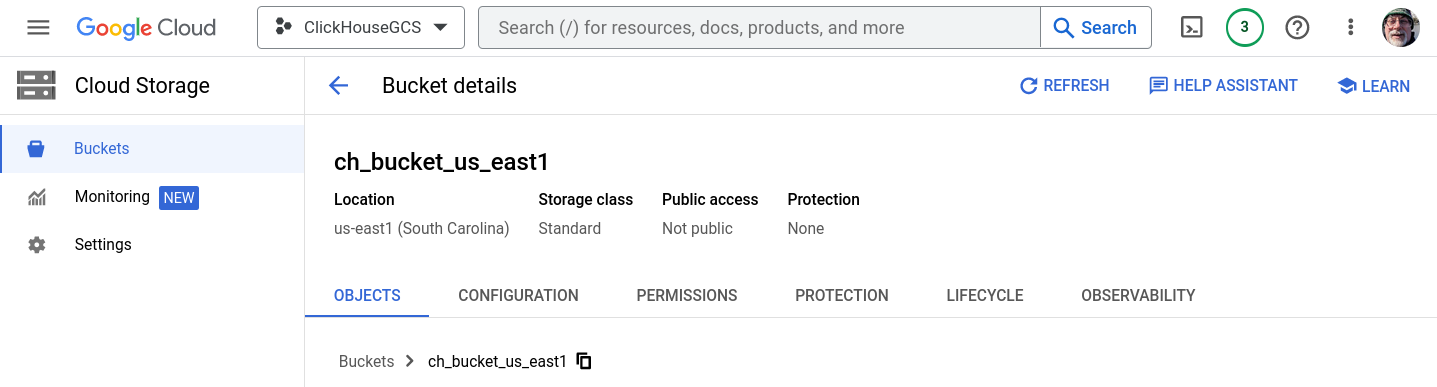 В Cloud Storage > Buckets выберите CREATE BUCKET. Для этого учебника создаются два ведра, одно в каждом из us-east1 и us-east4. Ведра являются одно-региональными, стандартного класса хранения и не являются публичными. При необходимости включите предотвращение публичного доступа. Не создавайте папки, они будут созданы, когда ClickHouse запишет в хранилище.