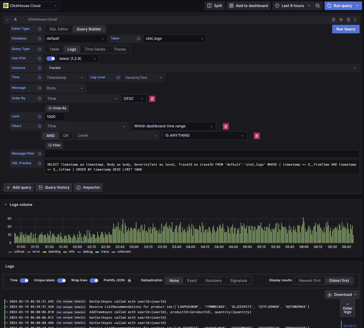 Тип запроса к логам предлагает конструктор запросов, сосредоточенный на запросах к данным логов. Предустановленные настройки могут быть настроены в конфигурации логов источника данных, чтобы конструктор запросов мог быть заранее загружен с предустановленной базой данных/таблицей и колонками. OpenTelemetry также может быть включен для автоматического выбора колонок в соответствии с версией схемы.