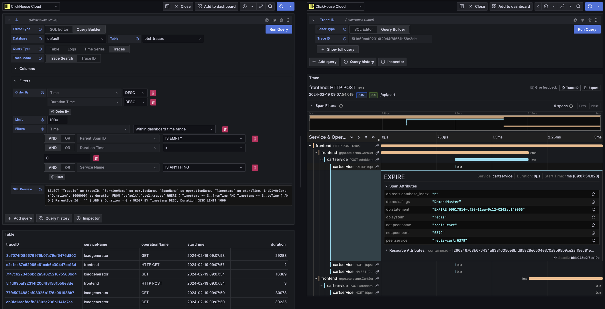 Этот тип запроса отобразит данные в представлении таблицы для режима Trace Search и в панели трасс для режима Trace ID.
