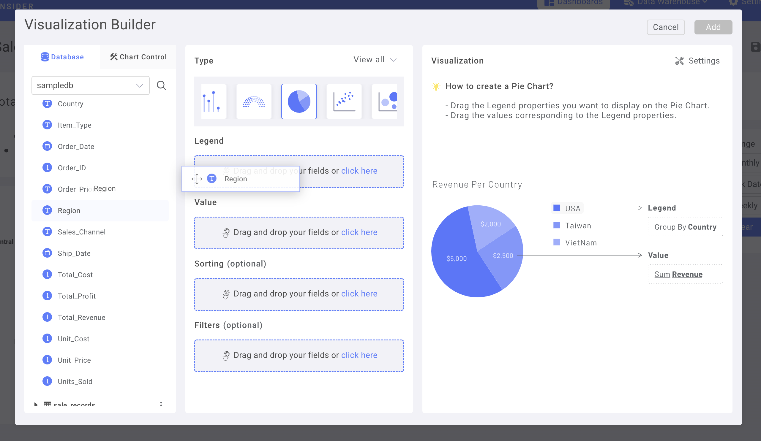 Сначала перетащите колонку "Регион" из набора данных в поле Легенды.