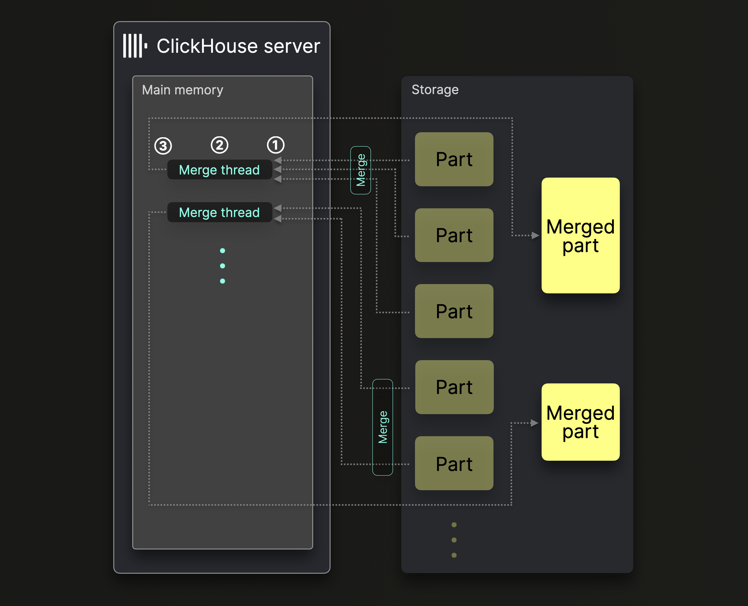 Один сервер ClickHouse использует несколько фоновых потоков слияния для выполнения одновременных слияний частей:
