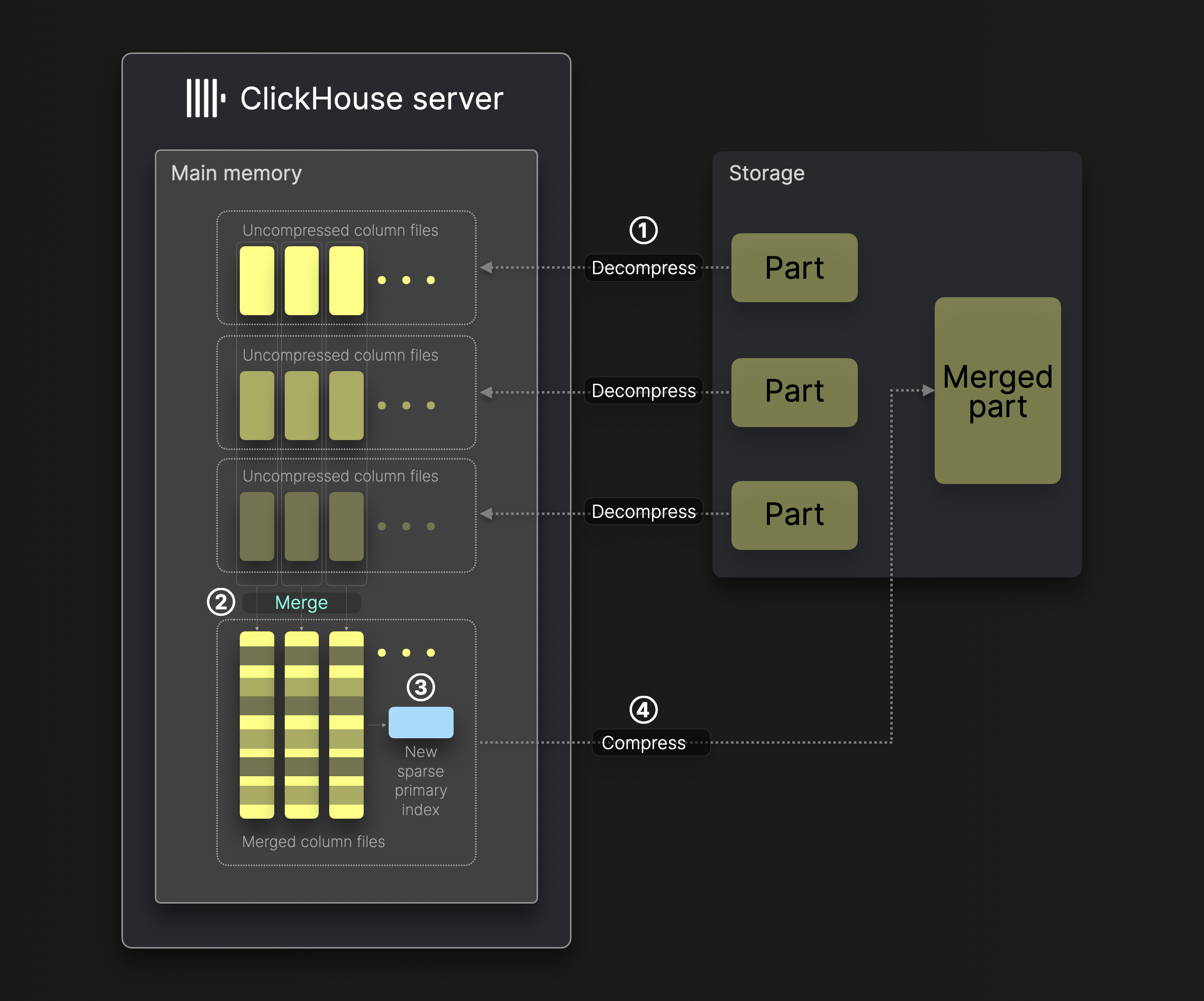 ① Декомпрессированные, предварительно отсортированные колонки таблицы ② сливаются с сохранением глобального порядка сортировки таблицы, определенного ключом сортировки таблицы, ③ создается новый разреженный первичный индекс, и ④ слитые файлы колонок и индекс сжимаются и сохраняются как новая часть данных на диске.