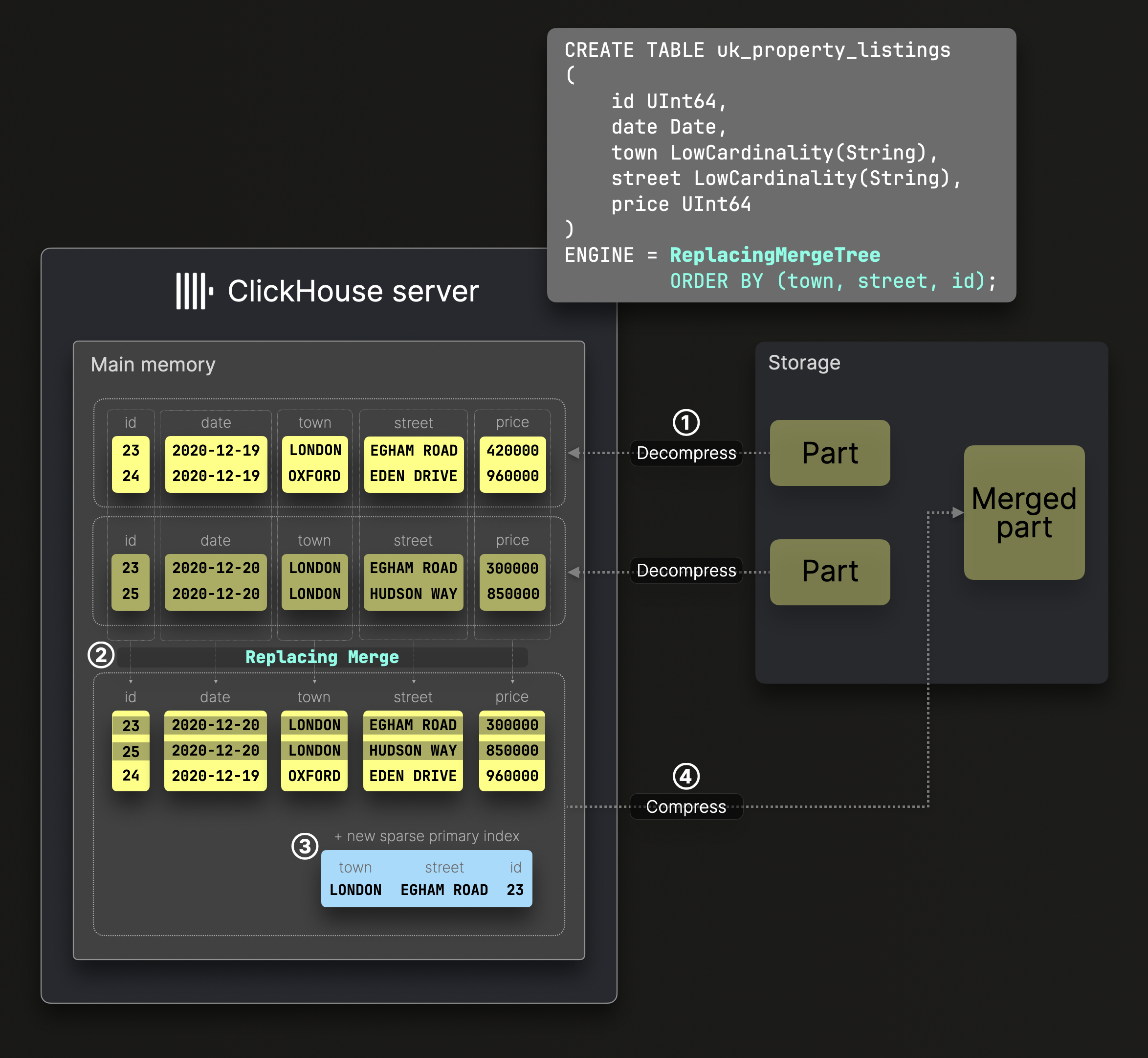 DDL-запрос в диаграмме выше создает таблицу ReplacingMergeTree с ключом сортировки (town, street, id), что означает, что данные на диске отсортированы по этим колонкам, и соответствующий разреженный первичный индекс генерируется.