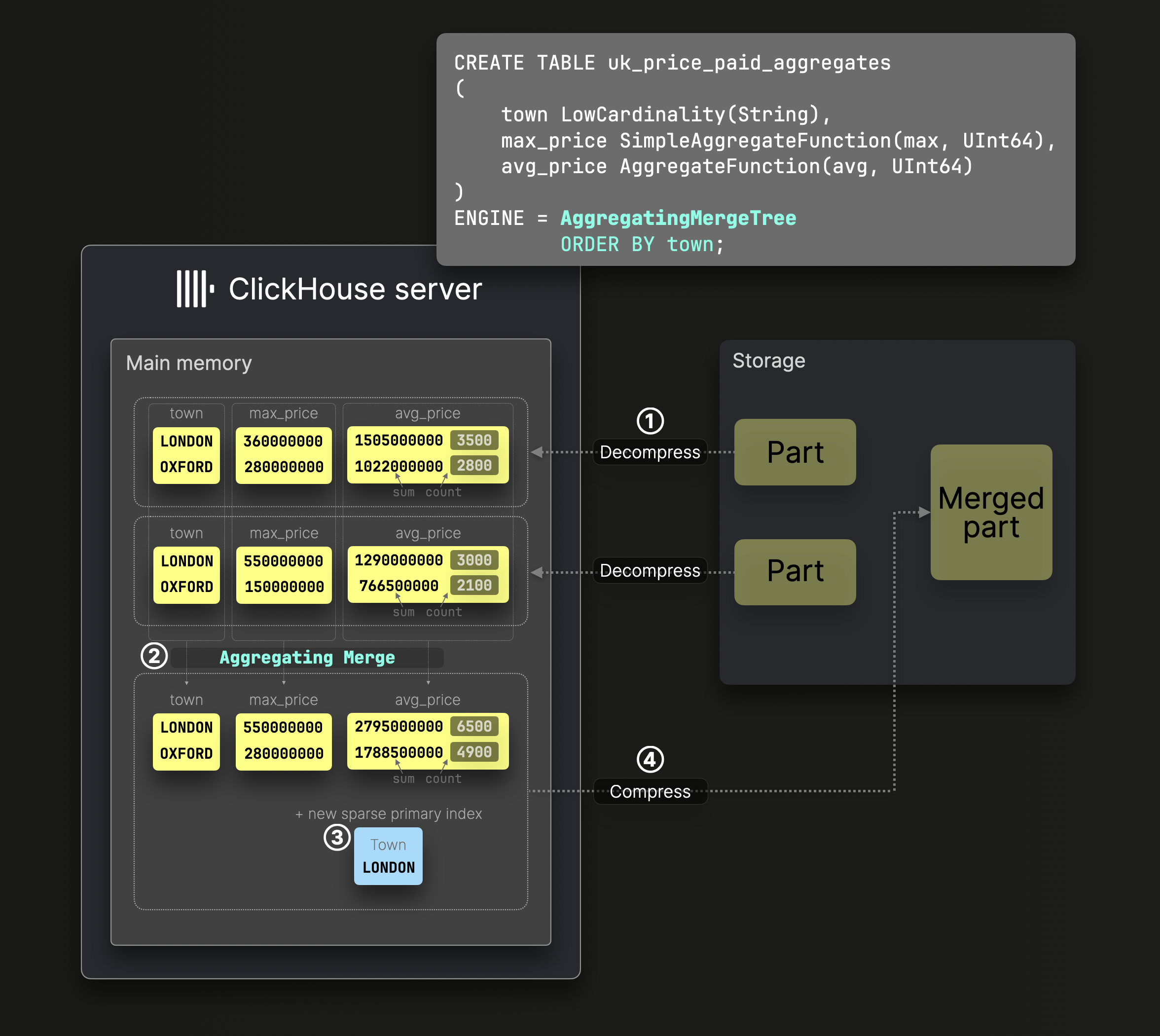 Во время ② слияния ClickHouse заменяет все строки с одинаковым ключом сортировки одной строкой, хранящей частичные состояния агрегации (например, sum и count для avg()). Эти состояния обеспечивают точные результаты с помощью инкрементных фоновых слияний.