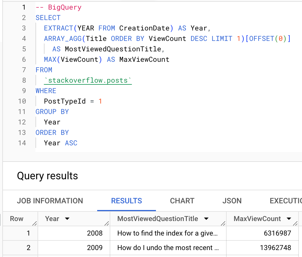 По возможности пользователям следует использовать агрегатные функции ClickHouse. Ниже мы показываем использование argMax функции для вычисления самого просматриваемого вопроса каждого года.