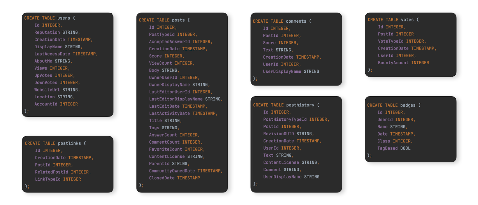 Для пользователей, которые хотят заполнить этот набор данных в экземпляре BigQuery, чтобы протестировать шаги миграции, мы предоставили данные для этих таблиц в формате Parquet в GCS-хранилище, а команды DDL для создания и загрузки таблиц в BigQuery доступны здесь.