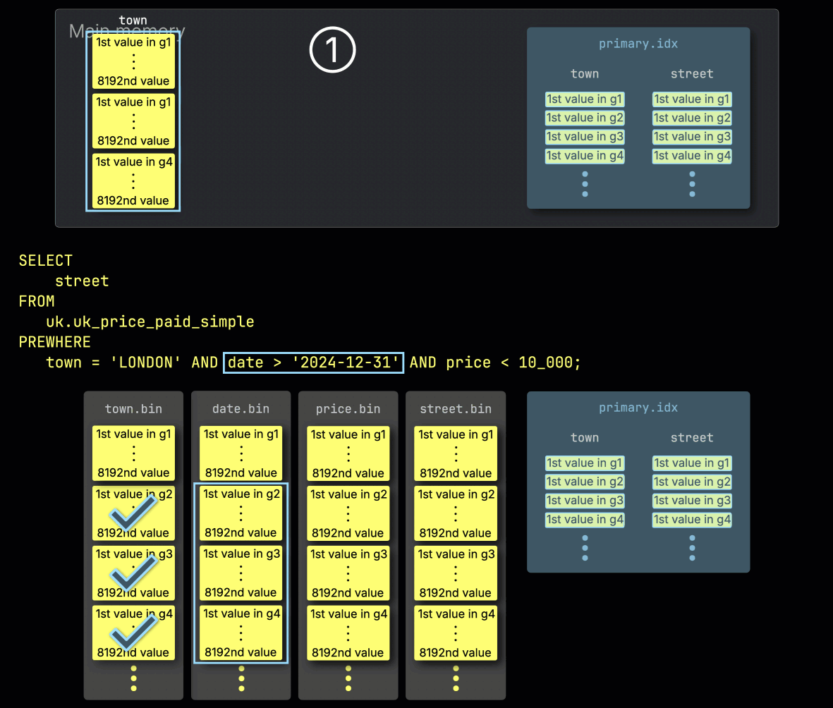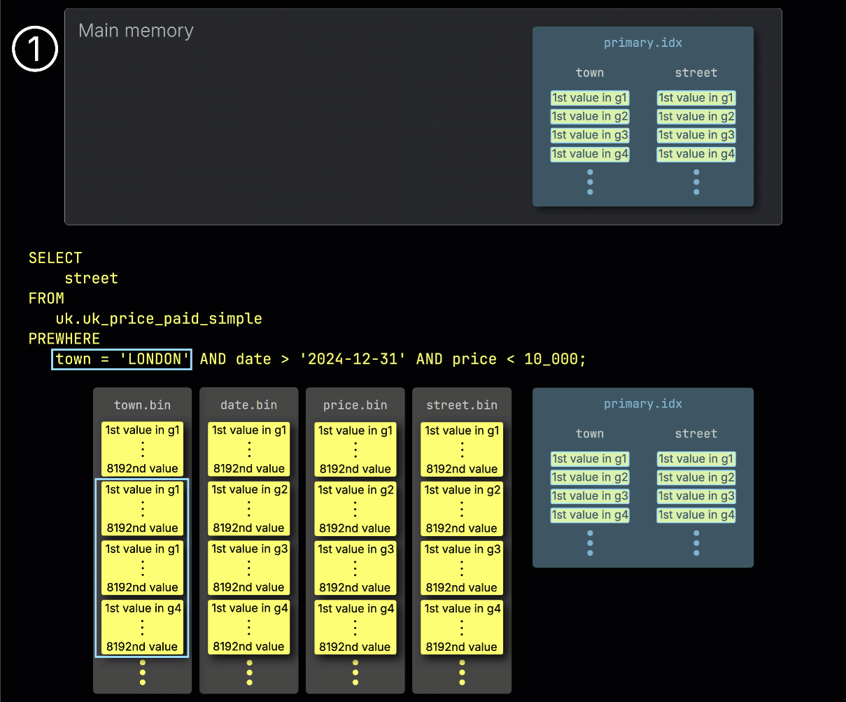 ClickHouse начинает обработку PREWHERE, ① считывая выбранные гранулы из колонки town и проверяя, какие из них содержат строки, соответствующие London.