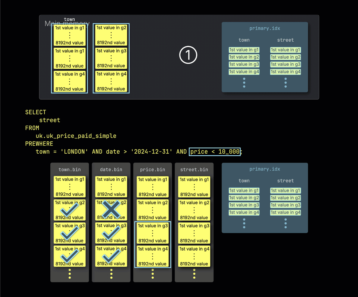 Наконец, ClickHouse ① считывает два выбранных гранула из колонки price, чтобы оценить последний фильтр price > 10_000.