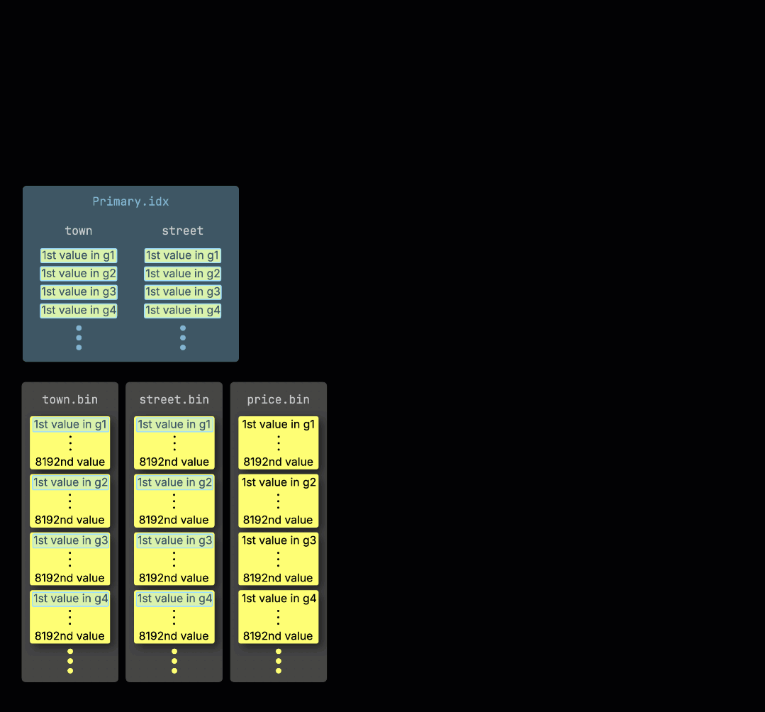 Как показано в выводе выше, запрос обработал 2.31 миллиона строк и прочитал 13.66 МБ данных. Это произошло потому, что на этапе анализа индекса ClickHouse выбрал 282 гранулы для обработки, каждая из которых содержит 8192 строки, в сумме примерно 2.31 миллиона строк: