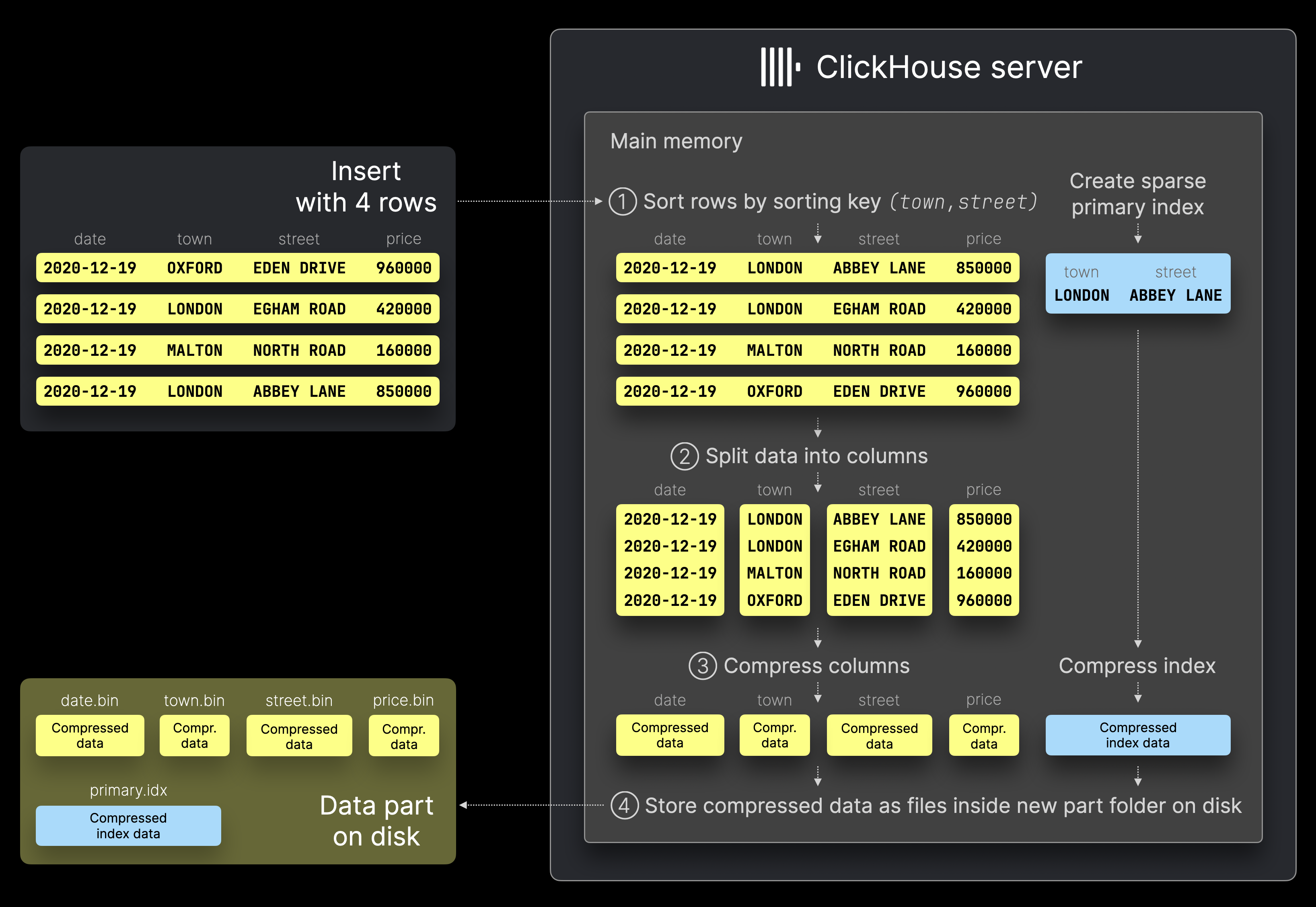Когда сервер ClickHouse обрабатывает пример вставки с 4 строками (например, через оператор INSERT INTO), как показано на диаграмме выше, он выполняет несколько шагов: