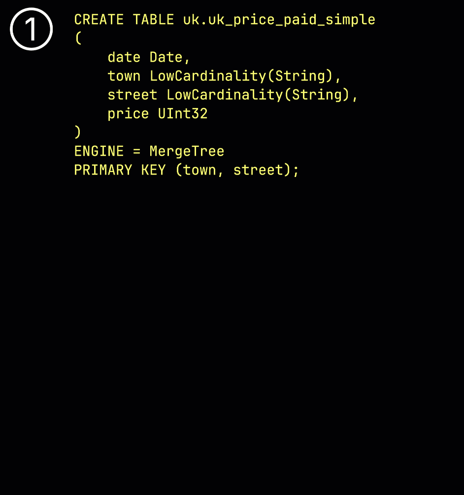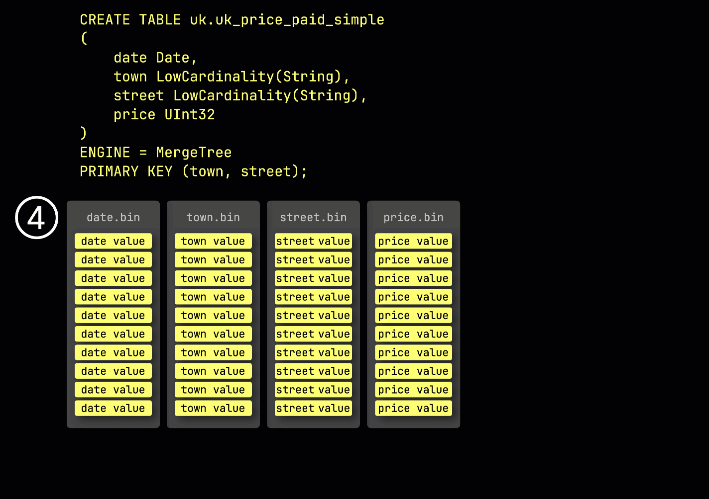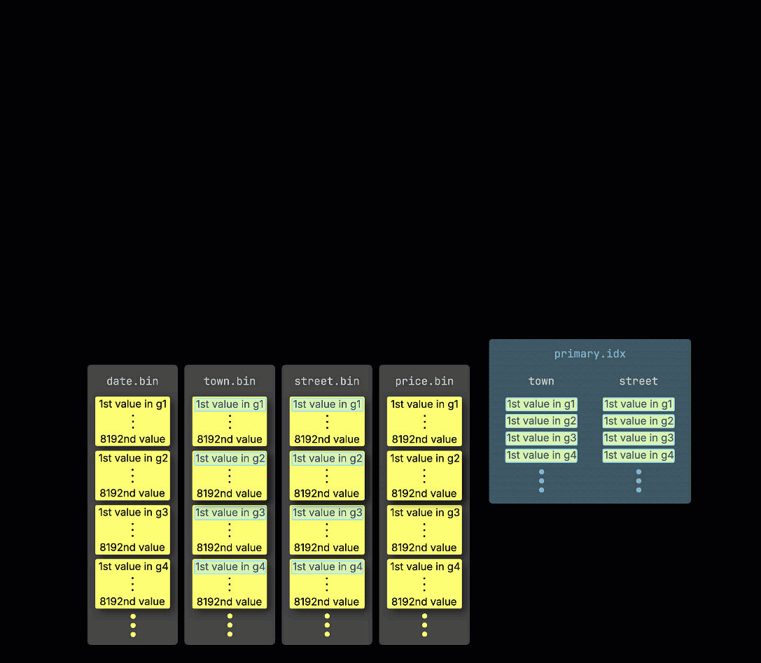Как напоминание, в нашей ① примерной таблице с первичным ключом (town, street), ② вставленные данные ③ хранятся на диске, отсортированные по значениям колонок первичного ключа и сжаты, в отдельных файлах для каждой колонки: