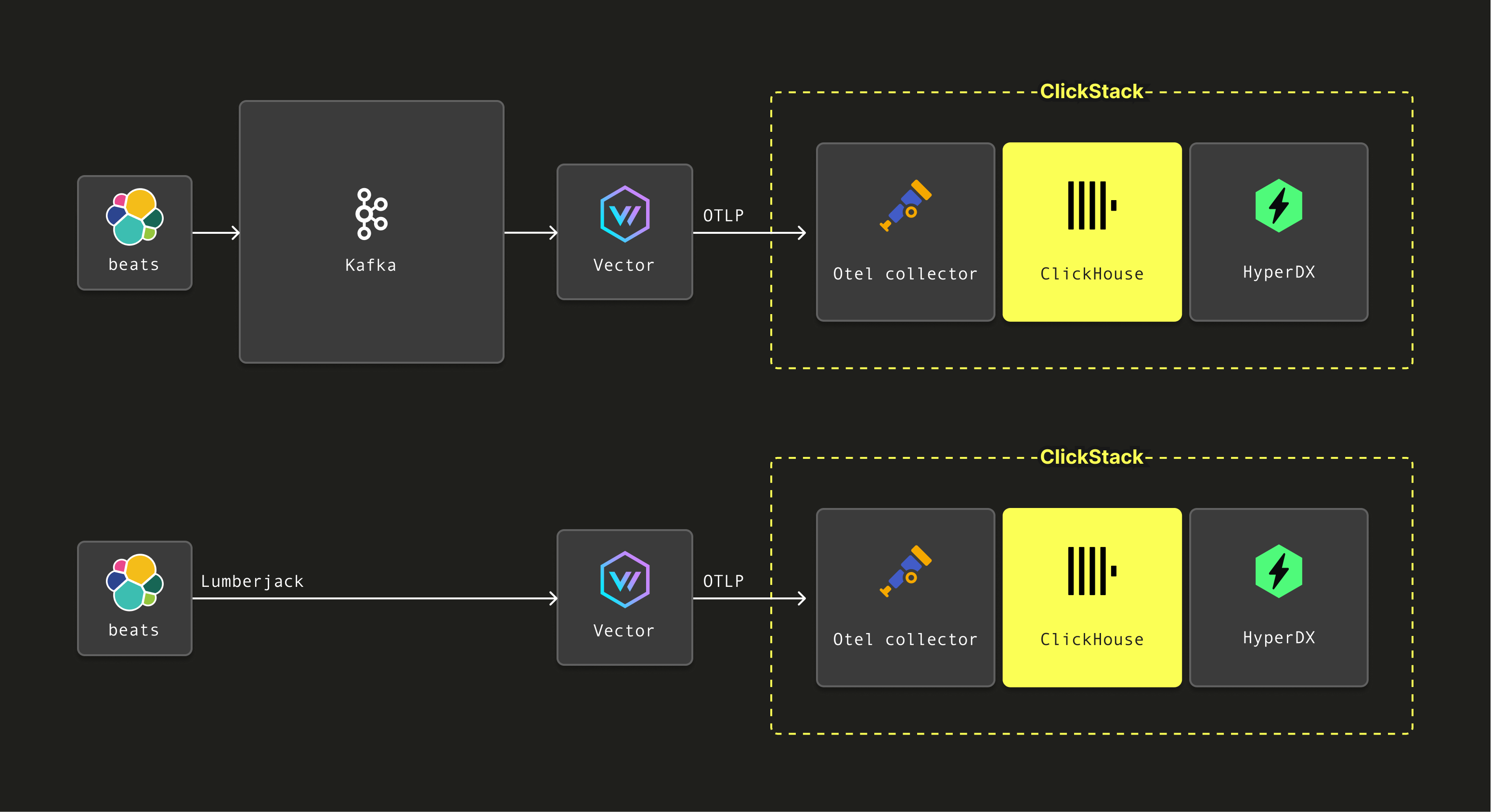 Alternatively, Vector also supports receiving events over the Lumberjack protocol used by Logstash. This enables Beats agents to send data directly to Vector, where the same transformation process can be applied before forwarding to the ClickStack OpenTelemetry Collector via OTLP.