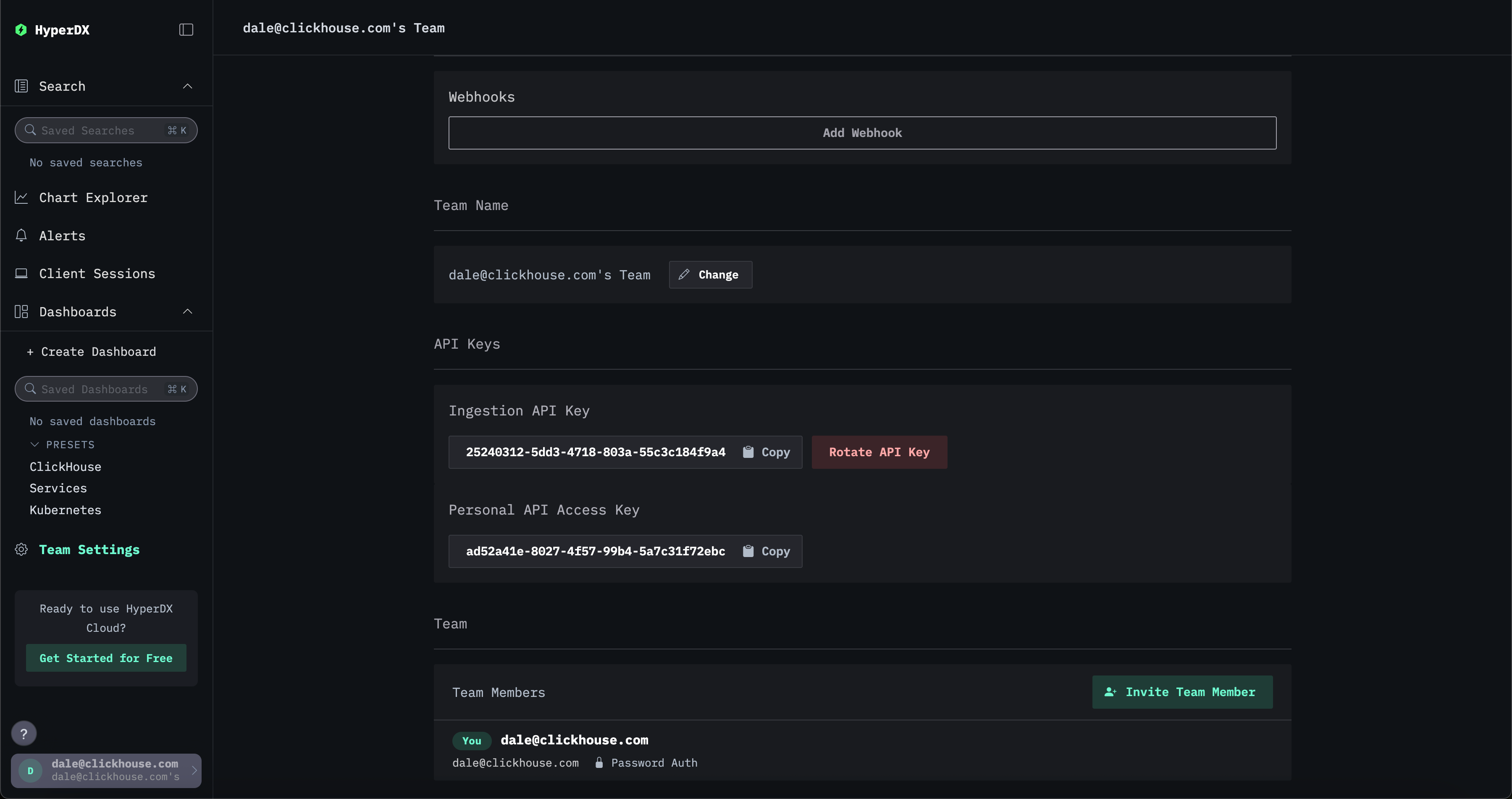 The YOUR_INGESTION_API_KEY here is produced by ClickStack. You can find the key in the HyperDX app under Team Settings → API Keys.